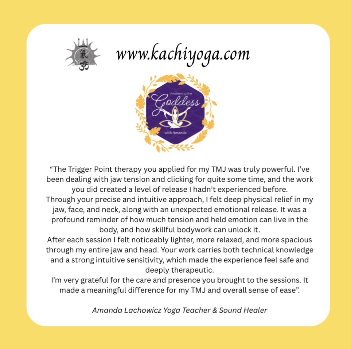 The trigger point therapy you applied for my TMJ was truly powerful. I’ve been dealing with jaw tension and clicking for quite some time, and the work you did created a level of release I hadn’t experienced before.Through your precise and intuitive approach, I felt deep physical relief in my jaw, face, and neck, along with an unexpected emotional release. It was a profound reminder of how much tension and held emotion can live in the body, and how skillful bodywork can unlock it.After each session I felt noticeably lighter, more relaxed, and more spacious through my entire jaw and head. Your work carries both technical knowledge and a strong intuitive sensitivity, which made the experience feel safe and deeply therapeutic.I’m very grateful for the care and presence you brought to the sessions. It made a meaningful difference for my TMJ and overall sense of ease.— Amanda Lachowicz Yoga Teacher & Sound Healer